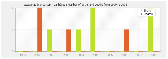Population of Lanhères was 57 inhabitants in 2007, 63 inhabitants in 1999, 43 inhabitants in 1990, 49 inhabitants in 1982, 58 inhabitants in 1975 and 72 inhabitants in 1968.