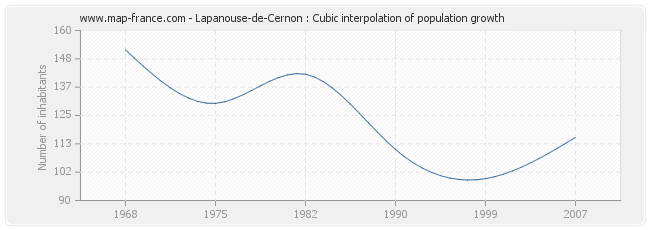 Population of Lapanouse-de-Cernon was 116 inhabitants in 2007, 99 inhabitants in 1999, 111 inhabitants in 1990, 142 inhabitants in 1982, 130 inhabitants in 1975 and 152 inhabitants in 1968.