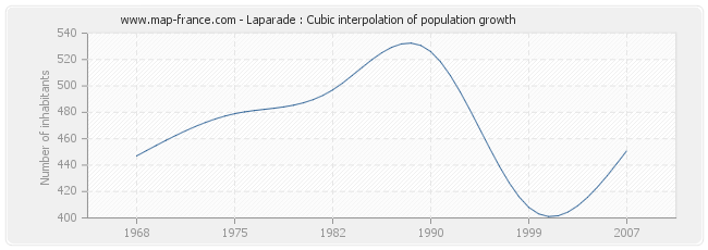 This curve shows the history of the population of Laparade from 1968 to 2007 in cubic interpolation. This provides more precisely the population of the municipality of Laparade the years where no census has been taken.