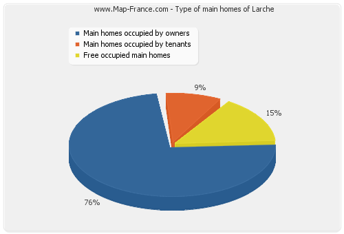 - Number of main homes of Larche occupied by owners : 25 - Number of main homes of Larche occupied by tenants : 3 - Number of main homes of Larche occupied free of charge : 5 |