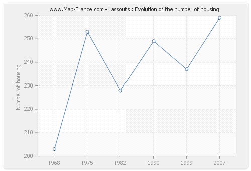 The number of housing of Lassouts was 259 in 2007, 237 in 1999, 249 in 1990, 228 in 1982, 253 in 1975 and 203 in 1968.