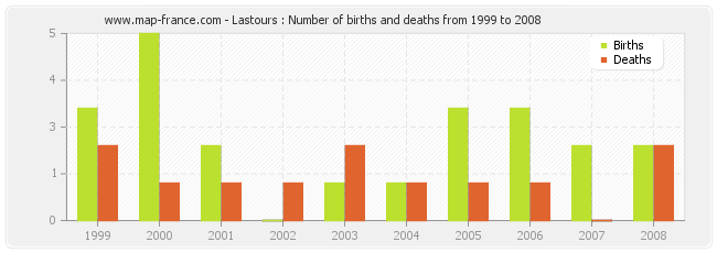Population of Lastours was 165 inhabitants in 2007, 163 inhabitants in 1999, 159 inhabitants in 1990, 248 inhabitants in 1982, 300 inhabitants in 1975 and 444 inhabitants in 1968.