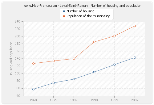 The population of Laval-Saint-Roman was 228 inhabitants in 2007, 201 inhabitants in 1999, 185 inhabitants in 1990, 140 inhabitants in 1982, 134 inhabitants in 1975 and 127 inhabitants in 1968. Meanwhile, the number of housing of Laval-Saint-Roman was 143 in 2007, 124 in 1999, 104 in 1990, 85 in 1982, 75 in 1975 and 58 in 1968.
