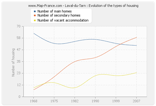 The following graphs show the history of the number and the type of housing of Laval-du-Tarn from 1968 to 2007. The second graph is drawn in cubic interpolation. This allows to obtain more exactly the number of accommodation of the town of Laval-du-Tarn years where no inventory was made.