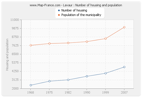 The population of Lavaur was 10 036 inhabitants in 2007, 8 543 inhabitants in 1999, 8 148 inhabitants in 1990, 7 972 inhabitants in 1982, 7 897 inhabitants in 1975 and 7 665 inhabitants in 1968. Meanwhile, the number of housing of Lavaur was 4 826 in 2007, 4 004 in 1999, 3 609 in 1990, 3 147 in 1982, 2 970 in 1975 and 2 445 in 1968.