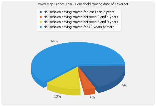 - Number of households of Laveraët having moved between 2 and 5 years : 2 - Number of households of Laveraët having moved between 5 and 9 years : 7 - Number of households of Laveraët having moved for 10 years or more : 34 |