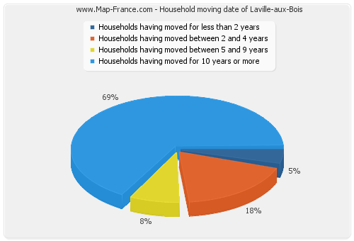 - Number of households of Laville-aux-Bois having moved between 2 and 5 years : 16 - Number of households of Laville-aux-Bois having moved between 5 and 9 years : 7 - Number of households of Laville-aux-Bois having moved for 10 years or more : 60 |