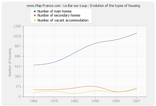 The number of housing of Le Bar-sur-Loup was 1 355 in 2007, 1 141 in 1999, 1 189 in 1990, 959 in 1982, 808 in 1975 and 726 in 1968.