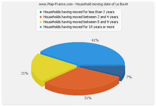 - Number of households of Le Buret having moved between 2 and 5 years : 36 - Number of households of Le Buret having moved between 5 and 9 years : 24 - Number of households of Le Buret having moved for 10 years or more : 47 |