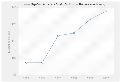 The number of housing of Le Buret was 137 in 2007, 131 in 1999, 121 in 1990, 119 in 1982, 99 in 1975 and 99 in 1968.