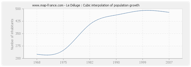 This curve shows the history of the population of Le Déluge from 1968 to 2007 in cubic interpolation. This provides more precisely the population of the municipality of Le Déluge the years where no census has been taken.