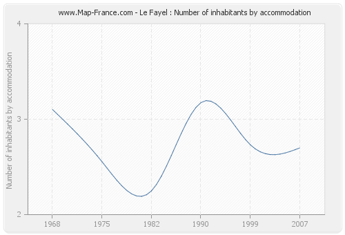 The population of Le Fayel was 243 inhabitants in 2007, 213 inhabitants in 1999, 200 inhabitants in 1990, 126 inhabitants in 1982, 120 inhabitants in 1975 and 124 inhabitants in 1968. Meanwhile, the number of housing of Le Fayel was 90 in 2007, 78 in 1999, 63 in 1990, 56 in 1982, 47 in 1975 and 40 in 1968.