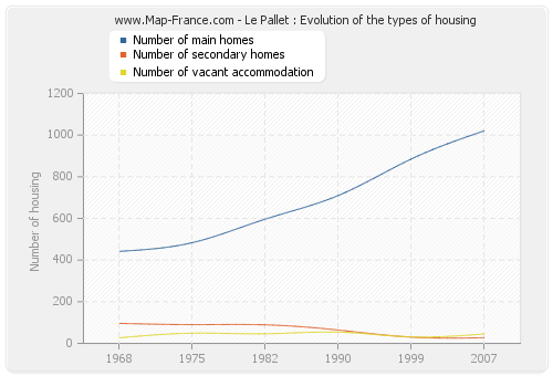 The following graphs show the history of the number and the type of housing of Le Pallet from 1968 to 2007. The second graph is drawn in cubic interpolation. This allows to obtain more exactly the number of accommodation of the city of Le Pallet years where no inventory was made.
