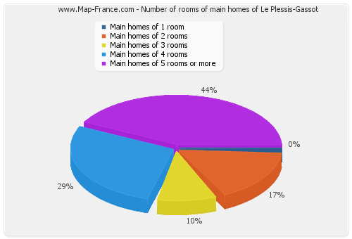 - Number of main homes of Le Plessis-Gassot of 1 room : 0 - Number of main homes of Le Plessis-Gassot of 2 rooms : 7 - Number of main homes of Le Plessis-Gassot of 3 rooms : 4 - Number of main homes of Le Plessis-Gassot of 4 rooms : 4 - Number of main homes of Le Plessis-Gassot of 5 rooms and more : 18 |