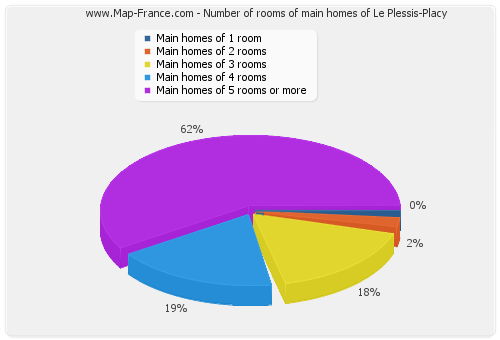 - Number of main homes of Le Plessis-Placy of 1 room : 0 - Number of main homes of Le Plessis-Placy of 2 rooms : 2 - Number of main homes of Le Plessis-Placy of 3 rooms : 16 - Number of main homes of Le Plessis-Placy of 4 rooms : 16 - Number of main homes of Le Plessis-Placy of 5 rooms and more : 56 |