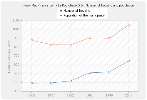 The population of Le Poujol-sur-Orb was 1 045 inhabitants in 2007, 898 inhabitants in 1999, 905 inhabitants in 1990, 825 inhabitants in 1982, 826 inhabitants in 1975 and 876 inhabitants in 1968. Meanwhile, the number of housing of Le Poujol-sur-Orb was 644 in 2007, 518 in 1999, 510 in 1990, 417 in 1982, 396 in 1975 and 391 in 1968.