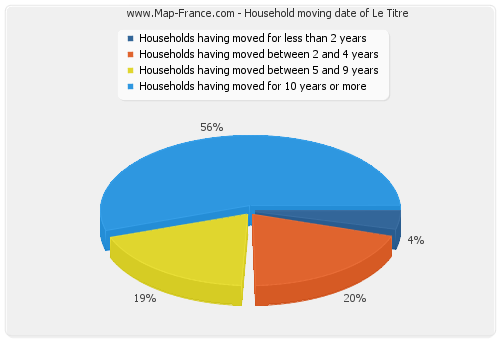 - Number of households of Le Titre having moved between 2 and 5 years : 28 - Number of households of Le Titre having moved between 5 and 9 years : 27 - Number of households of Le Titre having moved for 10 years or more : 79 |