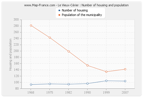 The population of Le Vieux-Cérier was 142 inhabitants in 2007, 134 inhabitants in 1999, 154 inhabitants in 1990, 199 inhabitants in 1982, 243 inhabitants in 1975 and 282 inhabitants in 1968. Meanwhile, the number of housing of Le Vieux-Cérier was 104 in 2007, 105 in 1999, 96 in 1990, 94 in 1982, 95 in 1975 and 93 in 1968.
