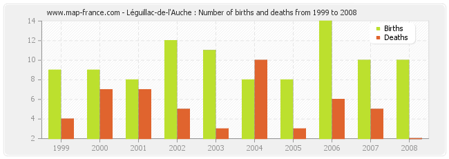 Léguillac-de-l'Auche : births and deaths from 1999 to 2008