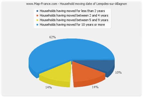 - Number of households of Lempdes-sur-Allagnon having moved between 2 and 5 years : 88 - Number of households of Lempdes-sur-Allagnon having moved between 5 and 9 years : 84 - Number of households of Lempdes-sur-Allagnon having moved for 10 years or more : 381 |