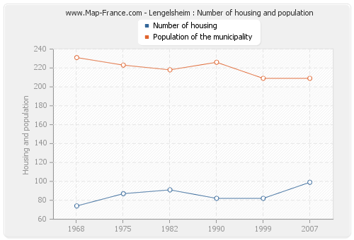 The population of Lengelsheim was 209 inhabitants in 2007, 209 inhabitants in 1999, 226 inhabitants in 1990, 218 inhabitants in 1982, 223 inhabitants in 1975 and 231 inhabitants in 1968. Meanwhile, the number of housing of Lengelsheim was 99 in 2007, 82 in 1999, 82 in 1990, 91 in 1982, 87 in 1975 and 74 in 1968.