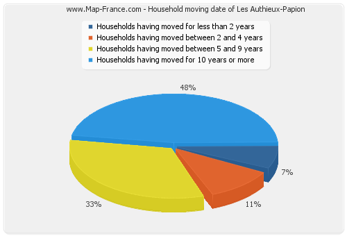 - Number of households of Les Authieux-Papion having moved between 2 and 5 years : 3 - Number of households of Les Authieux-Papion having moved between 5 and 9 years : 9 - Number of households of Les Authieux-Papion having moved for 10 years or more : 13 |