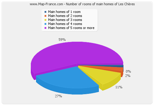 - Number of main homes of Les Chères of 1 room : 2 - Number of main homes of Les Chères of 2 rooms : 11 - Number of main homes of Les Chères of 3 rooms : 50 - Number of main homes of Les Chères of 4 rooms : 50 - Number of main homes of Les Chères of 5 rooms and more : 267 |