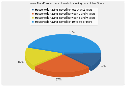 - Number of households of Les Gonds having moved between 2 and 5 years : 177 - Number of households of Les Gonds having moved between 5 and 9 years : 107 - Number of households of Les Gonds having moved for 10 years or more : 301 |