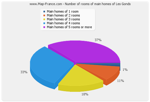 - Number of main homes of Les Gonds of 1 room : 7 - Number of main homes of Les Gonds of 2 rooms : 74 - Number of main homes of Les Gonds of 3 rooms : 121 - Number of main homes of Les Gonds of 4 rooms : 121 - Number of main homes of Les Gonds of 5 rooms and more : 245 |