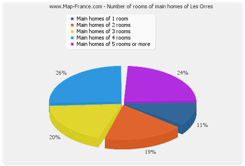 - Number of main homes of Les Orres of 1 room : 27 - Number of main homes of Les Orres of 2 rooms : 47 - Number of main homes of Les Orres of 3 rooms : 49 - Number of main homes of Les Orres of 4 rooms : 49 - Number of main homes of Les Orres of 5 rooms and more : 61 |