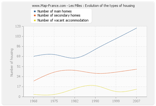 The following graphs show the history of the number and the type of housing of Les Pilles from 1968 to 2007. The second graph is drawn in cubic interpolation. This allows to obtain more exactly the number of accommodation of the town of Les Pilles years where no inventory was made.