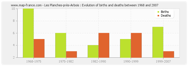 Les Planches-près-Arbois : evolution of births and deaths from 1968 to 2007
