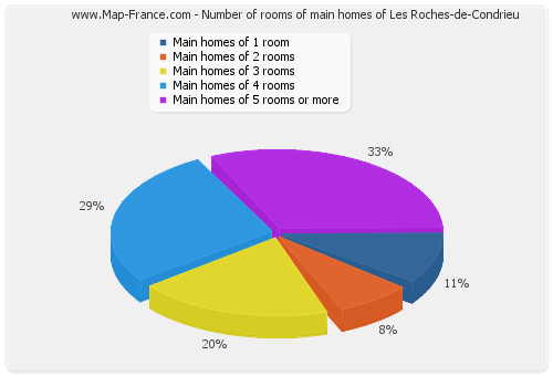 - Number of main homes of Les Roches-de-Condrieu of 1 room : 90 - Number of main homes of Les Roches-de-Condrieu of 2 rooms : 66 - Number of main homes of Les Roches-de-Condrieu of 3 rooms : 170 - Number of main homes of Les Roches-de-Condrieu of 4 rooms : 170 - Number of main homes of Les Roches-de-Condrieu of 5 rooms and more : 274 |