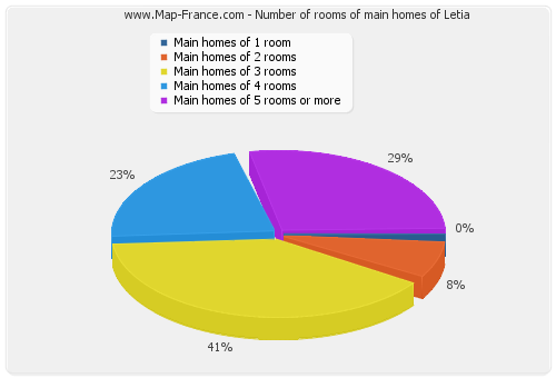 - Number of main homes of Letia of 1 room : 0 - Number of main homes of Letia of 2 rooms : 5 - Number of main homes of Letia of 3 rooms : 27 - Number of main homes of Letia of 4 rooms : 27 - Number of main homes of Letia of 5 rooms and more : 19 |