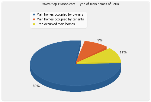 - Number of main homes of Letia occupied by owners : 52 - Number of main homes of Letia occupied by tenants : 6 - Number of main homes of Letia occupied free of charge : 7 |