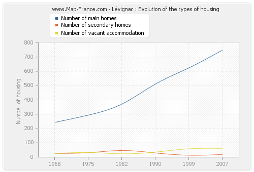 The following graphs show the history of the number and the type of housing of Lévignac from 1968 to 2007. The second graph is drawn in cubic interpolation. This allows to obtain more exactly the number of accommodation of the town of Lévignac years where no inventory was made.