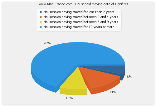 - Number of households of Lignières having moved between 2 and 5 years : 15 - Number of households of Lignières having moved between 5 and 9 years : 11 - Number of households of Lignières having moved for 10 years or more : 76 |