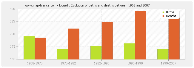 Ligueil : evolution of births and deaths from 1968 to 2007