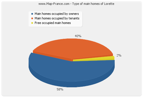 - Number of main homes of Lorette occupied by owners : 1 062 - Number of main homes of Lorette occupied by tenants : 732 - Number of main homes of Lorette occupied free of charge : 34 |
