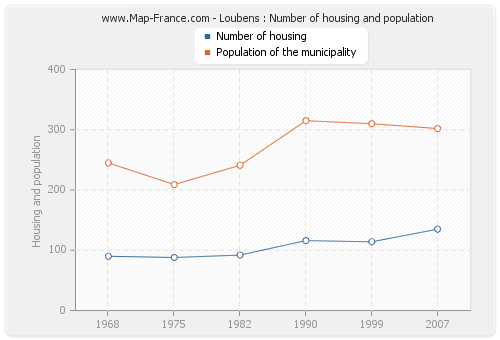 The population of Loubens was 302 inhabitants in 2007, 310 inhabitants in 1999, 315 inhabitants in 1990, 241 inhabitants in 1982, 209 inhabitants in 1975 and 245 inhabitants in 1968. Meanwhile, the number of housing of Loubens was 135 in 2007, 114 in 1999, 116 in 1990, 92 in 1982, 88 in 1975 and 90 in 1968.