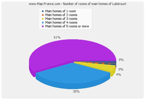 - Number of main homes of Lubécourt of 1 room : 0 - Number of main homes of Lubécourt of 2 rooms : 0 - Number of main homes of Lubécourt of 3 rooms : 1 - Number of main homes of Lubécourt of 4 rooms : 1 - Number of main homes of Lubécourt of 5 rooms and more : 14 |