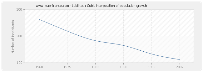 This curve shows the history of the population of Lubilhac from 1968 to 2007 in cubic interpolation. This provides more precisely the population of the municipality of Lubilhac the years where no census has been taken.