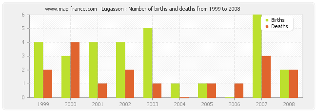 Lugasson : evolution of births and deaths from 1968 to 2007