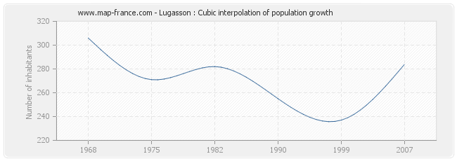This curve shows the history of the population of Lugasson from 1968 to 2007 in cubic interpolation. This provides more precisely the population of the municipality of Lugasson the years where no census has been taken.
