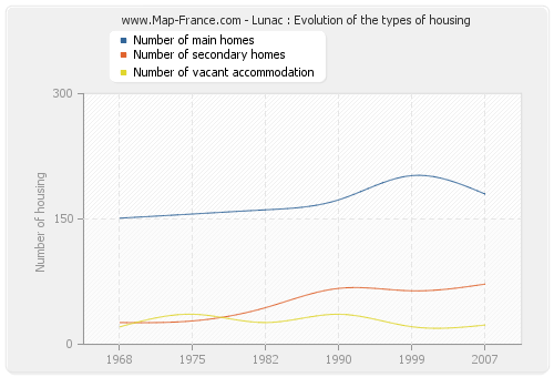 The number of housing of Lunac was 275 in 2007, 287 in 1999, 276 in 1990, 231 in 1982, 220 in 1975 and 198 in 1968.