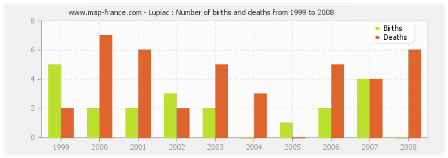 Lupiac : evolution of births and deaths from 1968 to 2007