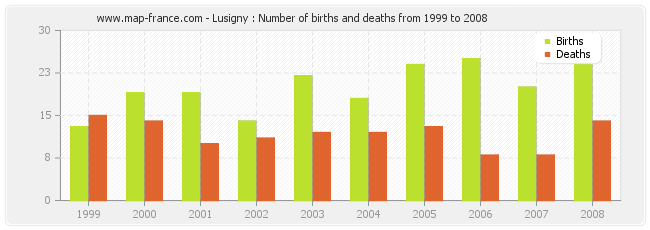 Lusigny : evolution of births and deaths from 1968 to 2007