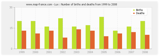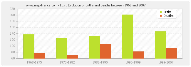 Population of Lux was 1 673 inhabitants in 2007, 1 619 inhabitants in 1999, 1 619 inhabitants in 1990, 1 619 inhabitants in 1982, 1 391 inhabitants in 1975 and 1 164 inhabitants in 1968.