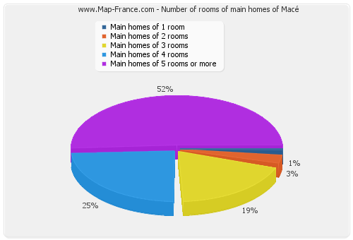 - Number of main homes of Macé of 1 room : 1 - Number of main homes of Macé of 2 rooms : 5 - Number of main homes of Macé of 3 rooms : 36 - Number of main homes of Macé of 4 rooms : 36 - Number of main homes of Macé of 5 rooms and more : 97 |