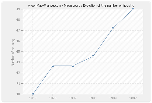 The number of housing of Magnicourt was 49 in 2007, 47 in 1999, 44 in 1990, 43 in 1982, 43 in 1975 and 40 in 1968.